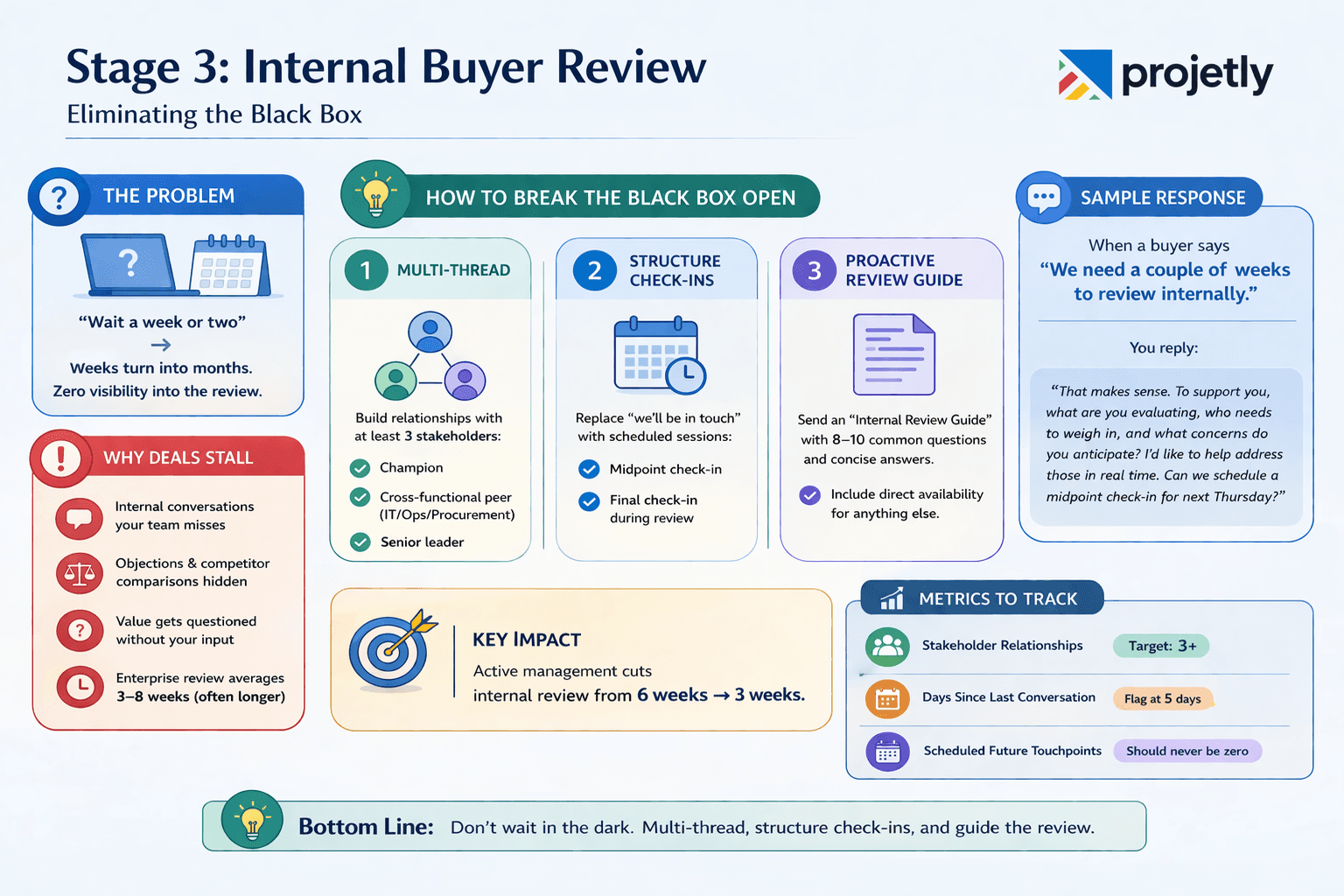 Why it happens: Internal reviews involve conversations you don't join, objections you don't hear, and competitor comparisons you can't influence. Your value gets questioned without representation. This phase averages 3–8 weeks, and without active management, it stretches longer.
