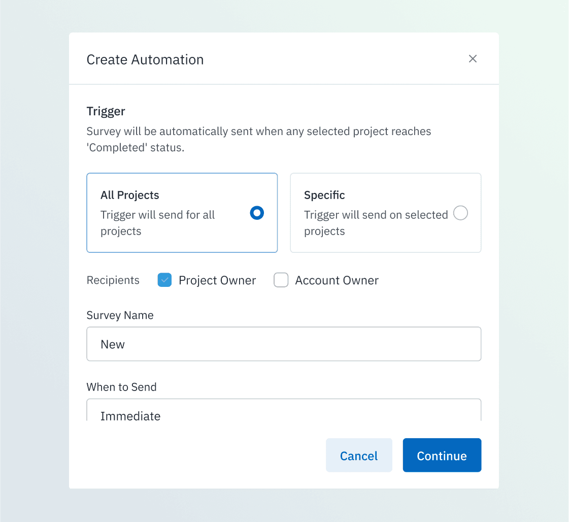 Share onboarding, milestone, and post-go-live surveys to capture intent, readiness, and feedback